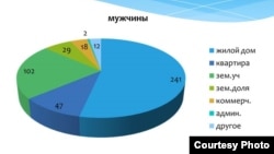 - Кыймылсыз мүлк сатып алууда, сатууда аялдардын укугу тебеленеби, жокпу деген изилдөө жүргүзүлдү. Бул жаатта кандайдыр бир деңгээлде дисбаланс сакталып келет. Кыймылсыз мүлктүн түрлөрүнө болгон укуктарды каттаганда кызыктуу жагдайларга туш болдук. Бишкекте үйлөр көбүнесе аялдарга катталган экен, республика боюнча алганда деле батирлер айымдарга катталыптыр. Ал эми калган турак үйлөр, жер тилкелердин басымдуу бөлүгү эркектердин атында экен.